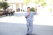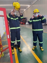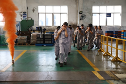 消防演练在生产科长孟晓洋向总指挥杨文芳请求启动厂区应急预案后正式开始,应急救援小组组长黄珂在大群中通知各应急小组到2号车间门口等待救援,顾俊涛、郭松涛迅速穿上防护服、戴好面罩进入2号车间模拟消防救援,其他小组在2号车间门外做好等待工作。